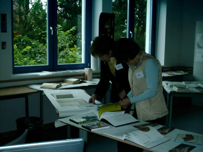 | Zwei Kolleginnen schauen kritisch die Ausstellung an und äußern sich lobend über das Dargebotene
